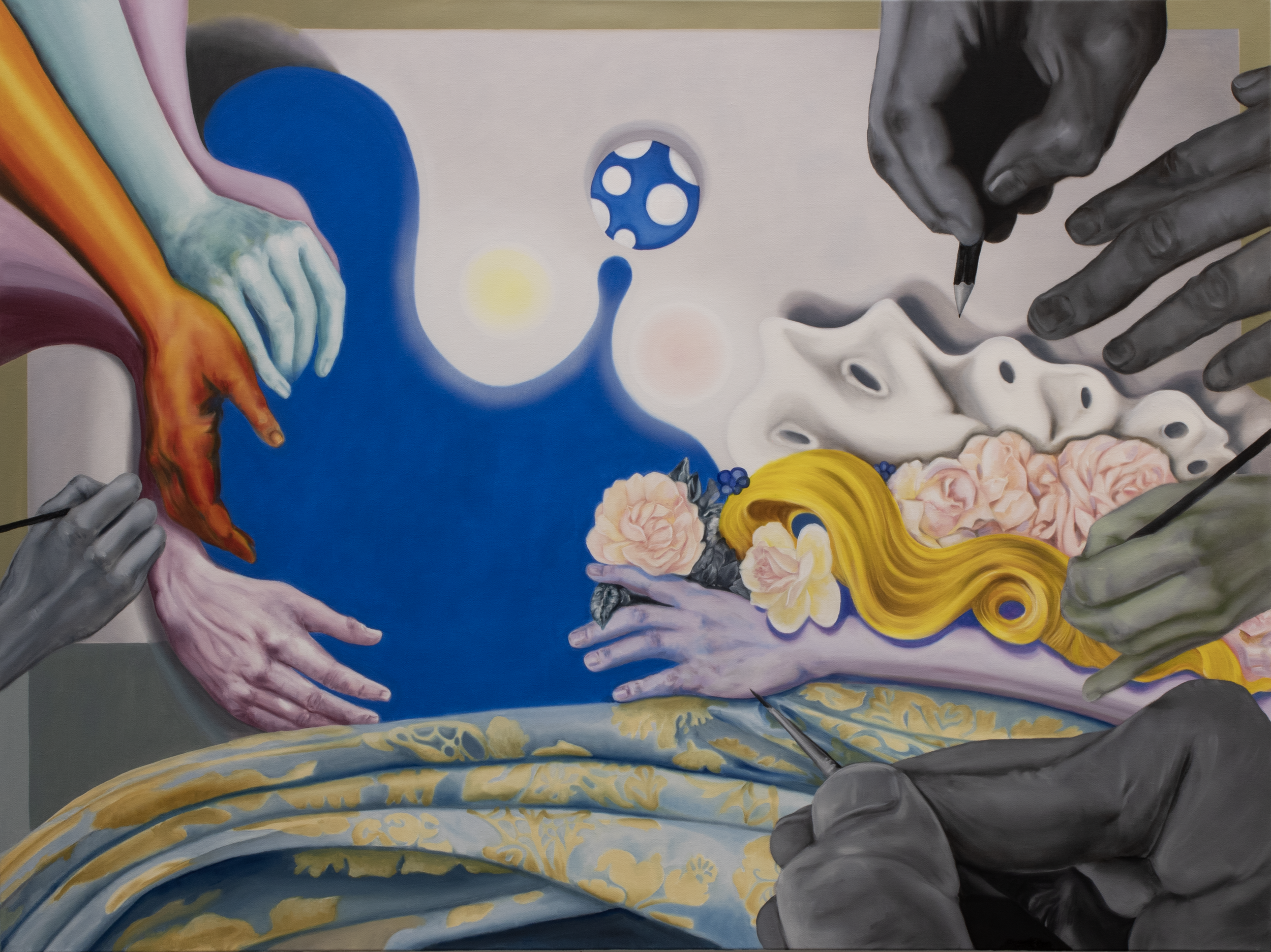 From painting to photography, both mediums are used to reflect my vision of a distorted, yet somewhat figurative universe of likeable beings, performing poetically their (co-)existence.